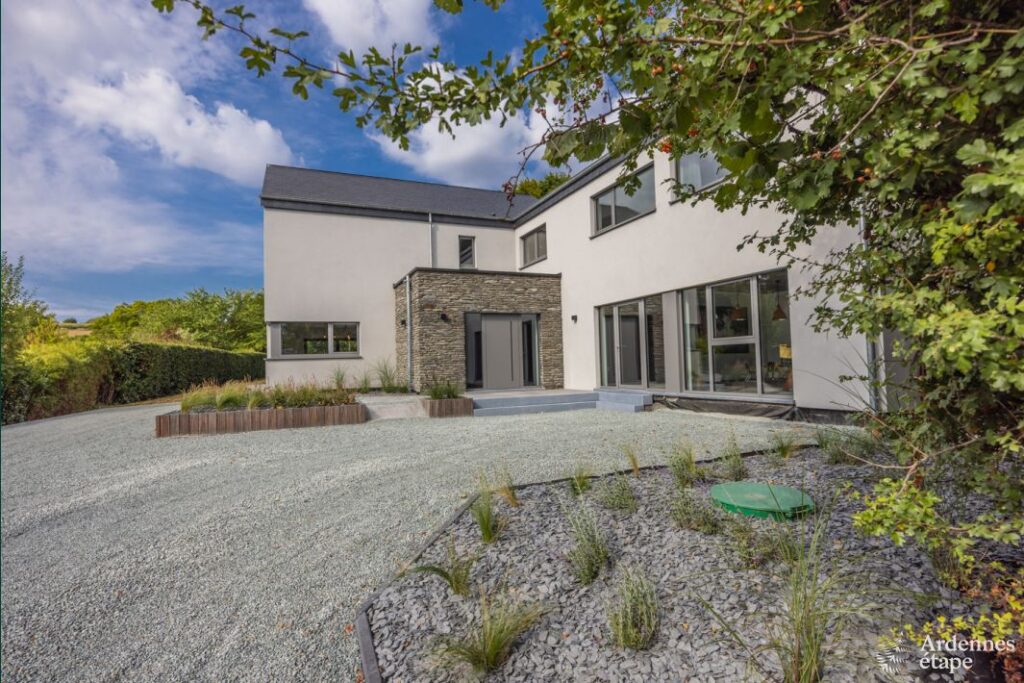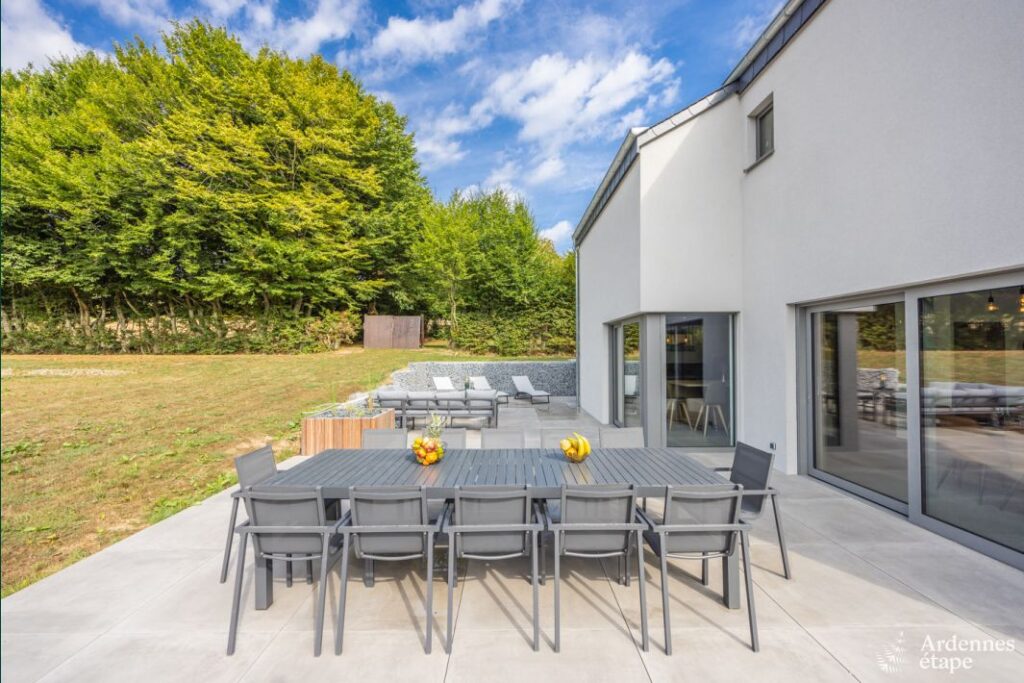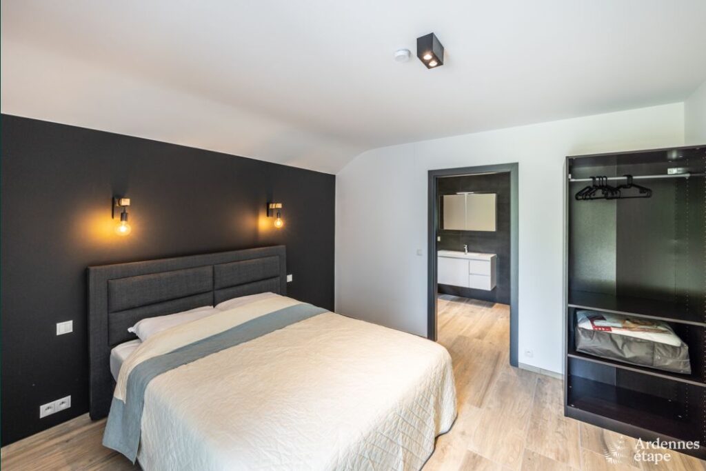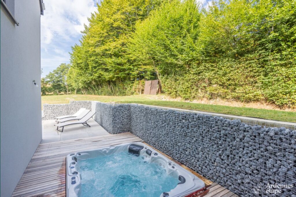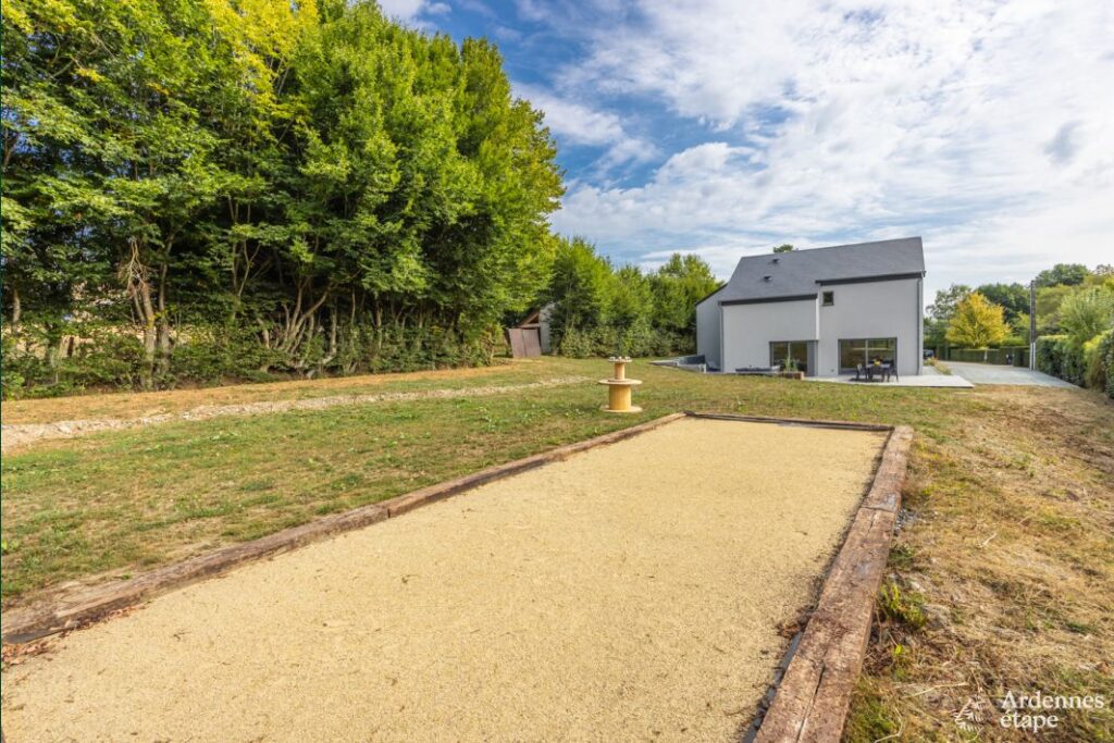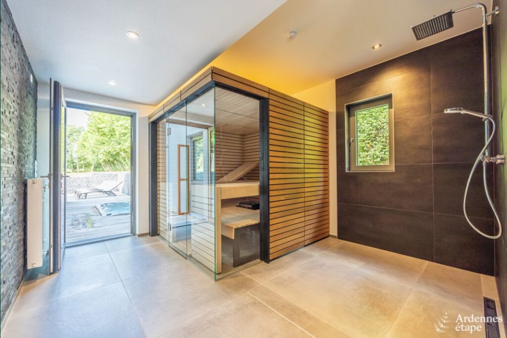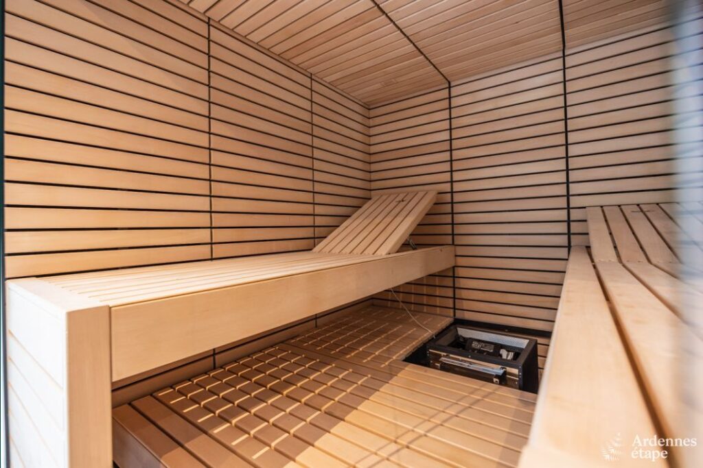 Cette luxueuse villa avec sauna, jacuzzi et terrain de pétanque se trouve à proximité d’une forêt et d’une rivière.